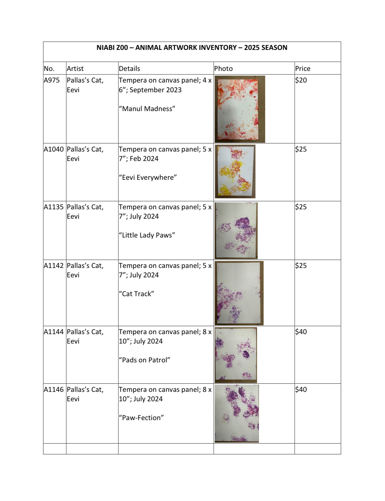 For anyone in the area, Niabi Zoo is selling paintings by Eevie and Haruto the next three weekends.